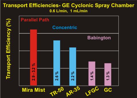 Greater Sample Transport! With smaller droplets, the vaporization is faster which improves the stability and sensitivity. It also can increase the amount of sample that is delivered to the torch. As the intensity and sensitivity of the instrument is directly related to the number of atoms in the plasma, higher transport rates improve the sensitivity as long as the droplets are small enough to easily vaporize. With the Mira Mist nebulizers, both factors are present: smaller droplets (as shown above) and higher transport rates as shown by the following comparison data from work by John Olesik, of Ohio State University: